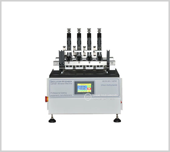 La máquina de prueba Wyzenbeek es un probador de cilindros oscilatorios. La muestra se cortaría en tiras. La muestra de tela en forma de tira se instala en las abrazaderas delantera y trasera del cabezal de abrasión y se aplica una cierta tensión. El medio de fricción se instala en el rodillo de abrasión en forma de arco, de modo que la muestra entre en contacto con el medio de abrasión y aplique una cierta carga sobre la muestra. El rodillo de abrasión se mueve hacia adelante y hacia atrás para frotar la muestra. Después de ciertos ciclos, se prueba la fuerza de tracción de la muestra para evaluar el cambio en la resistencia a la rotura antes y después de la abrasión.